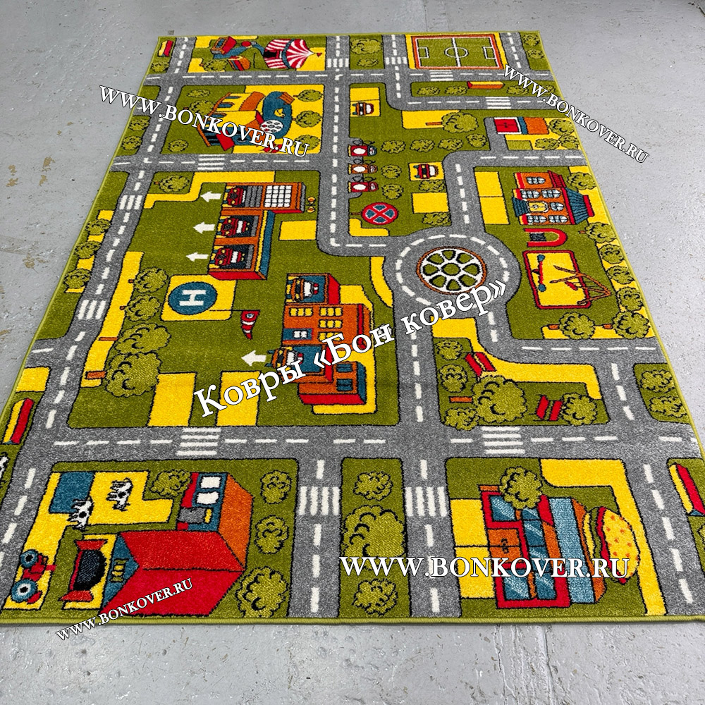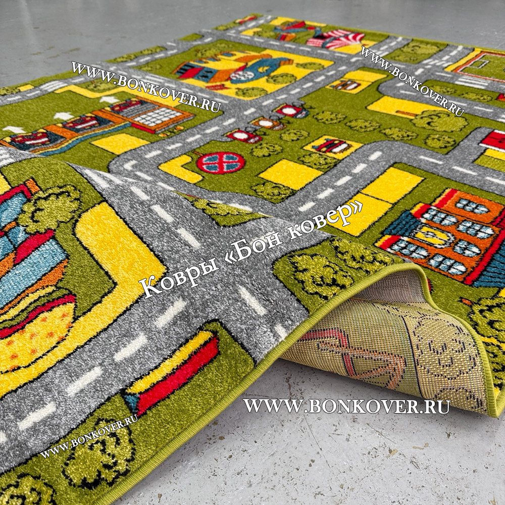 Детский Ковер Город 02 Зеленый не деформируется, сохраняет свою форму. Ворс легко восстанавливается, что не оставляет на поверхности изделия неприглядных отметин.